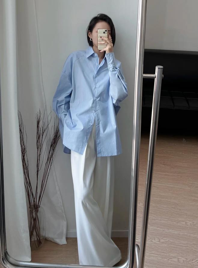 自然舒適的一套,冰川藍色很適合春夏季節,上下兩件的設計比較簡單,版型都是寬鬆的,就這麼搭配在一起太有鬆弛感了,慵懶又高級,清爽且氣質。