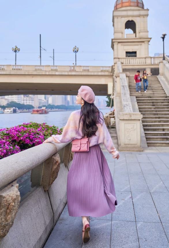 自帶浪漫氣息的丁香粉紫,上下裝的顏色都是一致的,這樣的配色能減少出錯率,更適合一些搭配小白。粉紫色的百褶裙,超顯浪漫的,也不失優雅與氣質。