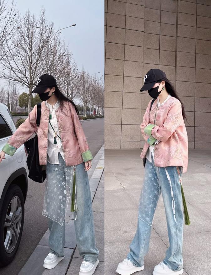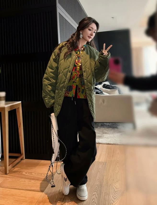 大冪冪不愧是時尚界的潮弄兒,即便是選擇了看似有些花哨的新中式上衣。也能穿得很時髦。她在外面疊穿了一件綠色棉衣,既保暖又沒有違和感,大膽的配色,真的不禁讓人讚歎一句:會穿!