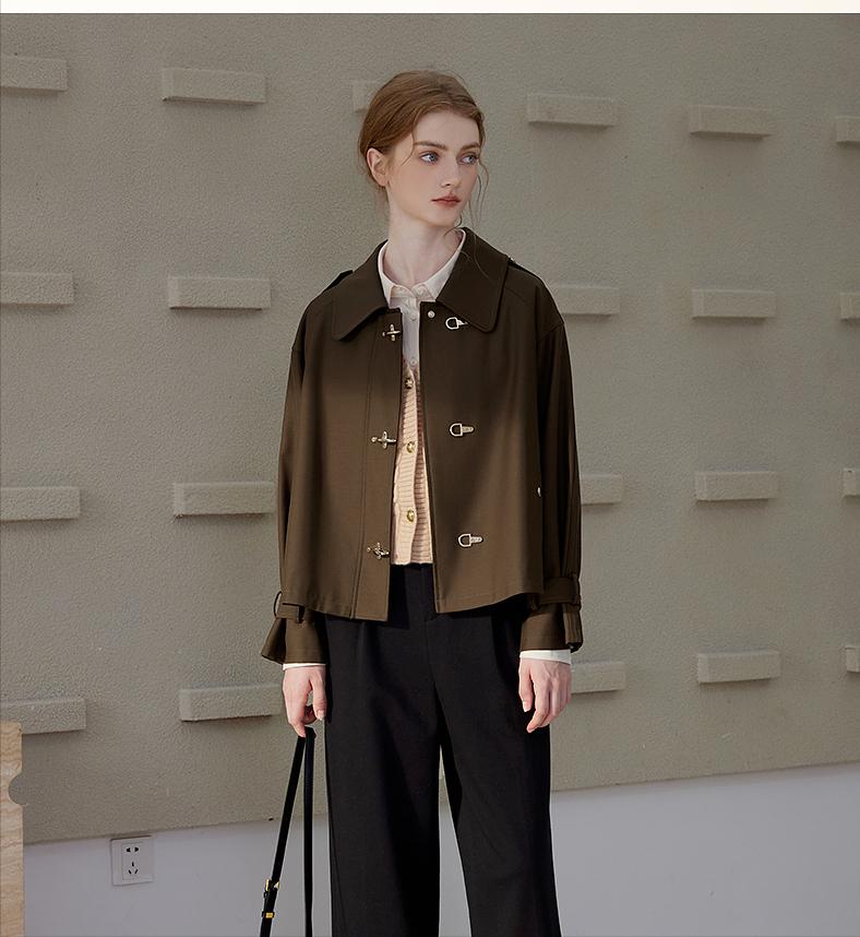 小個子女生穿的短款風衣,這種款式沒有新潮高端的剪裁設計,也沒有繁瑣隆重的華美裝飾,基本上大西裝領+腰帶紐扣,隨意搭配就非常耐看。