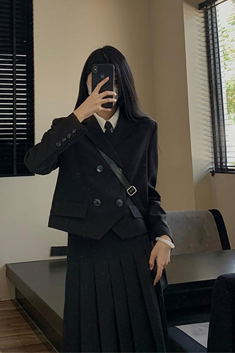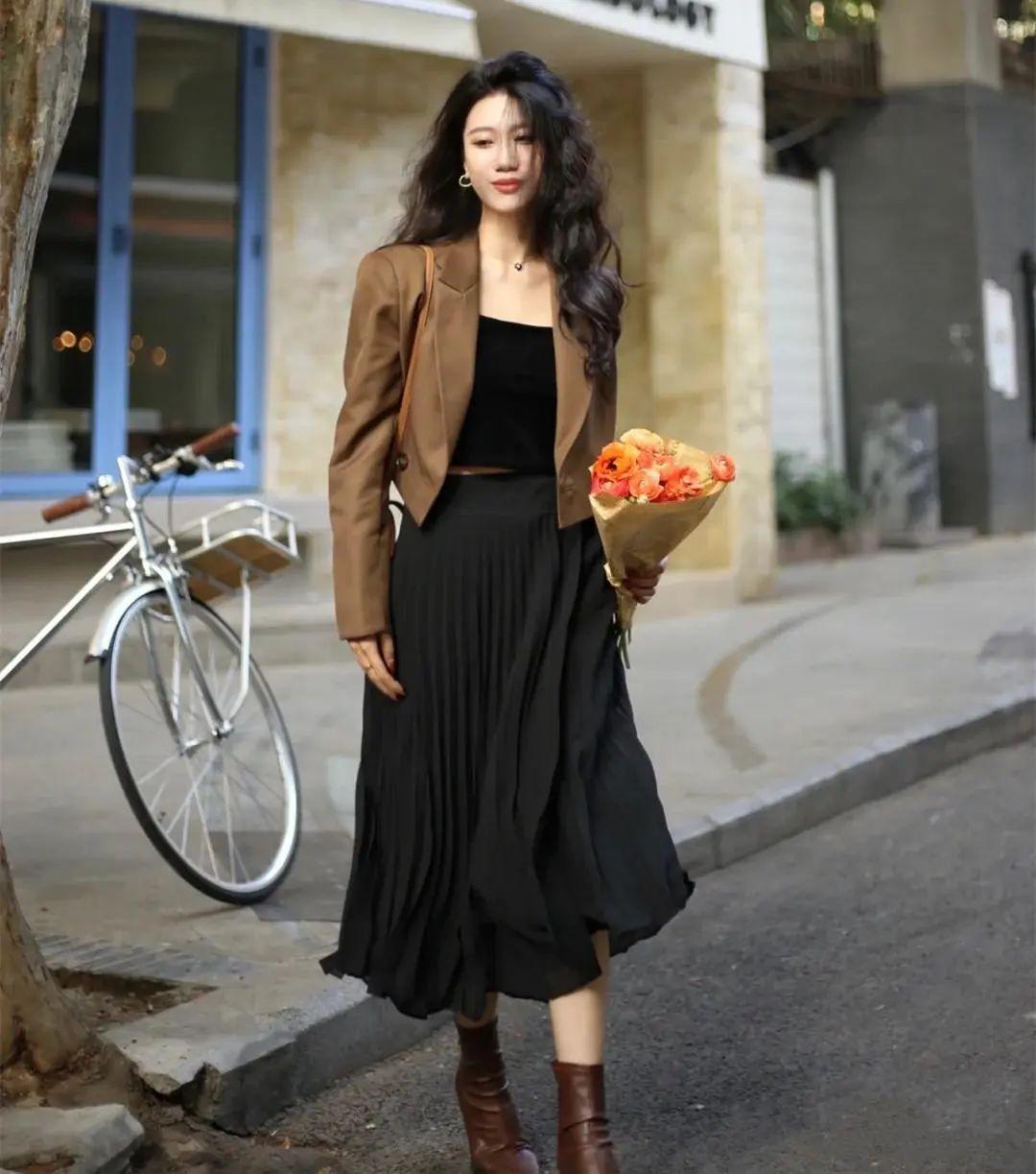 當然了,小個子還可以嘗試JK風格的短款西裝+同色系百褶半身裙,修身的剪裁能夠展現出你的身材優勢,搭配一些裝飾,能夠讓整體搭配更加協調。
