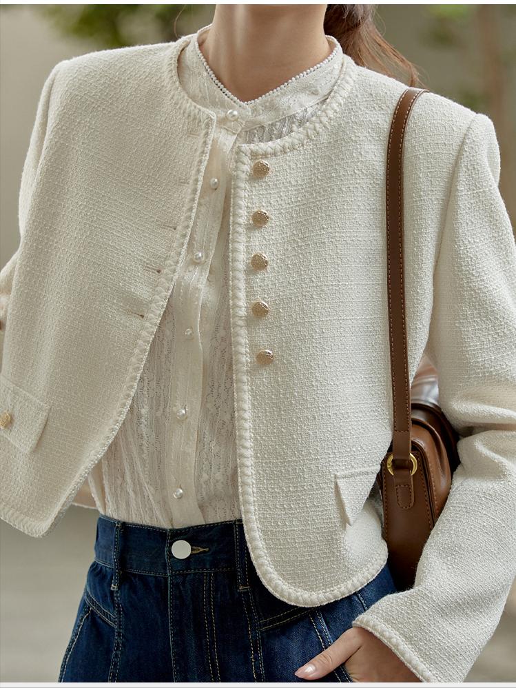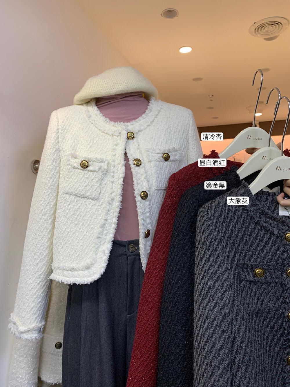 白色復古的小香風簡約、優雅和精緻,延續了圓領小香風的經典風格,給人一種優雅、高貴的感覺。這套搭配可以適應各種場合,無論是正式的商務場合、晚宴還是休閒的週末活動,輕鬆穿出氣質感。