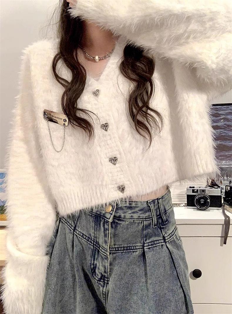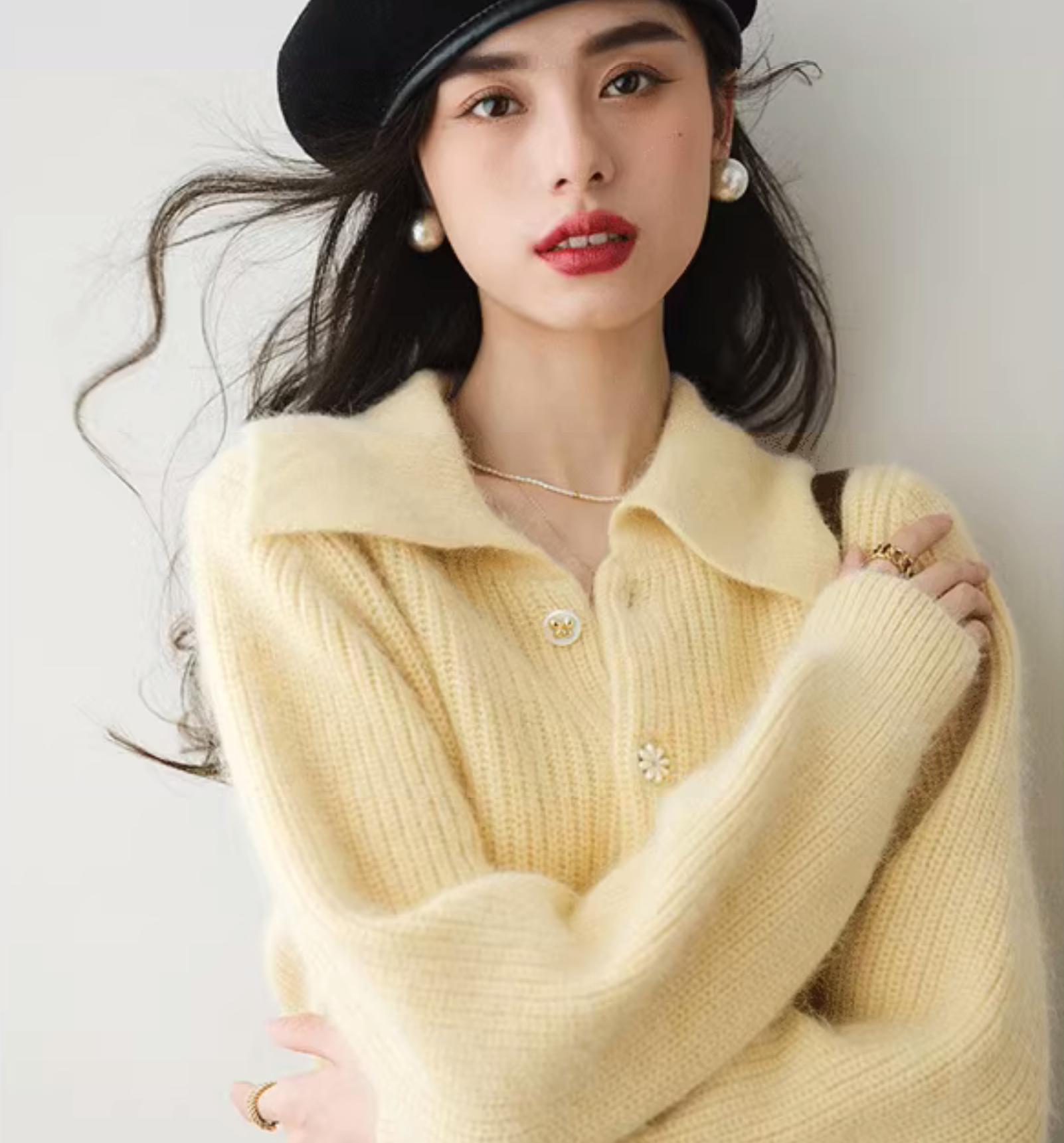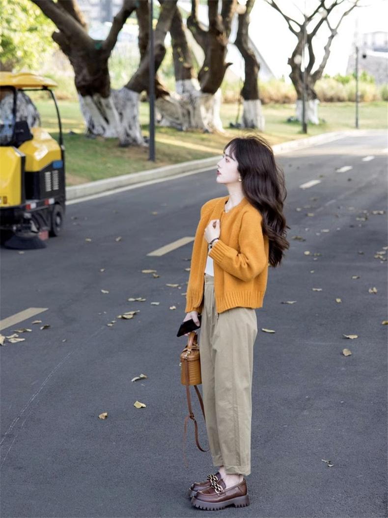 米黃色的短款毛衣開衫,非常適合溫柔的小姐姐,搭配牛仔褲或裙子,展現優雅的氣質。