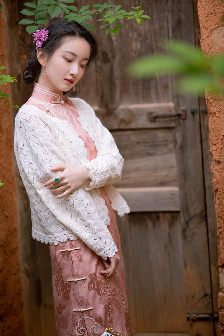喜歡穿旗袍的女性還可以選擇這種白色的針織開衫,白色開衫與粉色旗袍,能夠展現出整體的和諧感。花紋針織點綴,展現出開衫的優雅氣質。