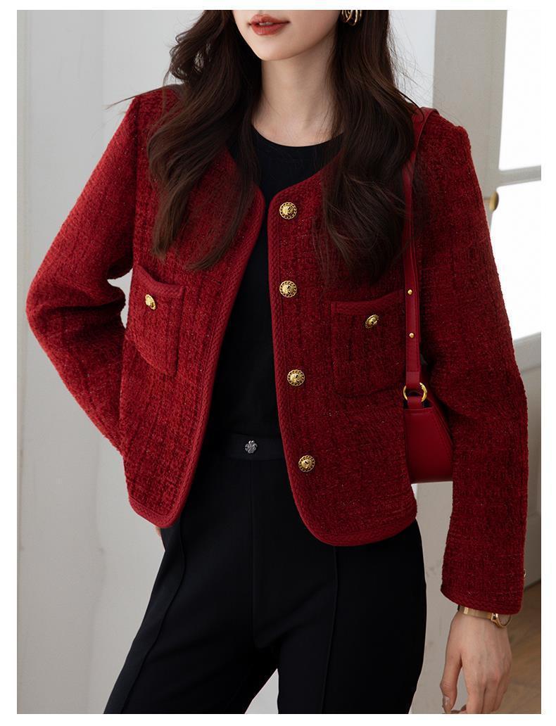 紅色短款小香風外套的面料是編織而成的粗花呢面料,摸上去有明顯的紋路和立體感,搭配紅色的內搭和半身裙,穿在身上厚實且有高級質感。