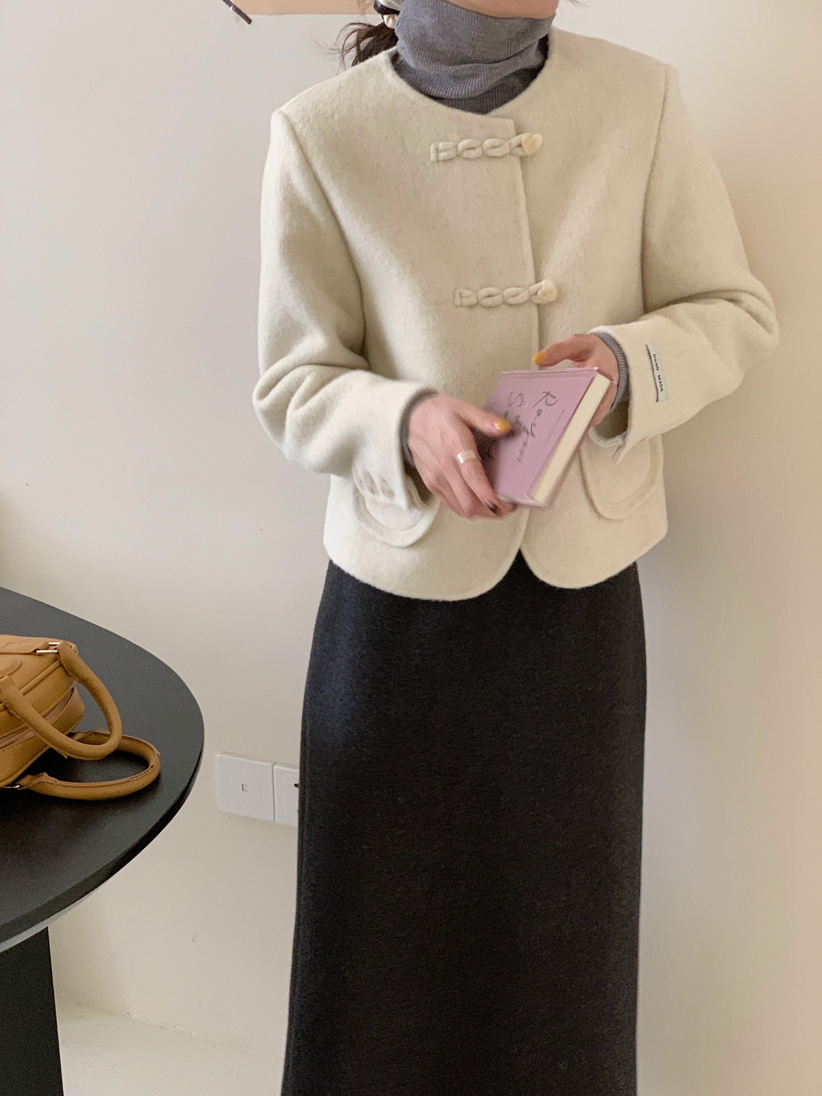 新中式盤扣的小香風外套,既有中式味道,也有“香奶奶”的精緻感。米色外套+灰色打底衫+黑色半身裙,這樣的組合能保持舒適感,又能展現優雅氣質。