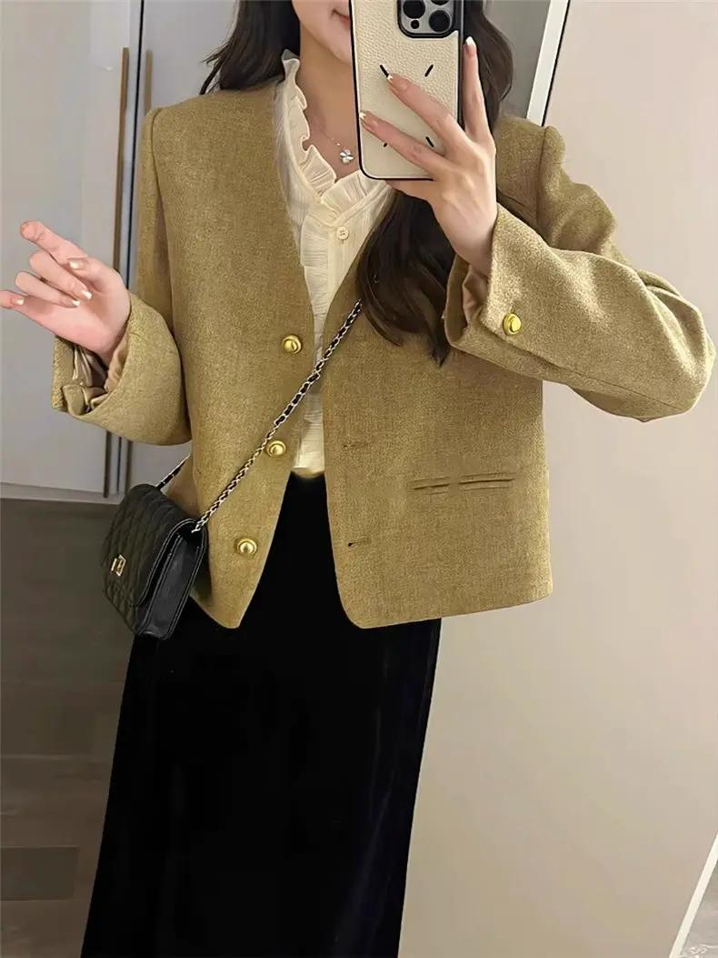 薑黃色V領小西裝自帶復古的宮廷貴族氣質,既可以搭配新中式的襯衫,可以讓整體造型更加時尚和個性化。也可以是蝴蝶結襯衫,更加幹練和時尚。