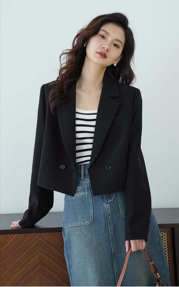小個子穿西裝外套,駕馭不了大廓形西裝,一定要試試這種短款正肩西裝,剪裁設計沒有那麼生硬死板,搭配也比較靈活。可休閒、可通勤、也可復古摩登。搭配牛仔褲和條紋衫,好看且不費力展露時髦感。