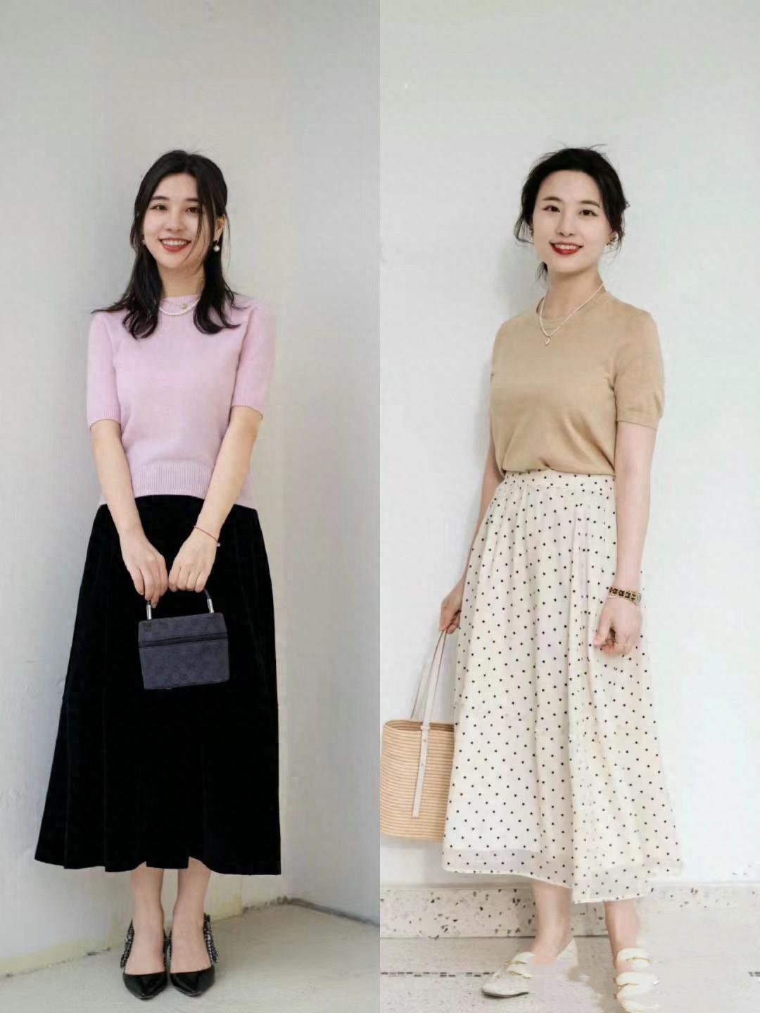 不管是卡其色針織衫、還是淺粉色針織衫,稍微帶有一定寬鬆度的設計,對於40歲女人的身體形態也具備了更強的包容性。像這種寬鬆針織衫、極簡風的設計搭配半身裙就很耐看。