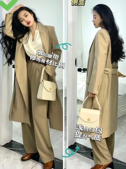 風衣的穿搭,也可以更加霸氣拉風。像這種風衣套裝的組合,給人一種霸道總裁的既視感。內搭是緞面襯衫,也更凸顯了貴氣美。