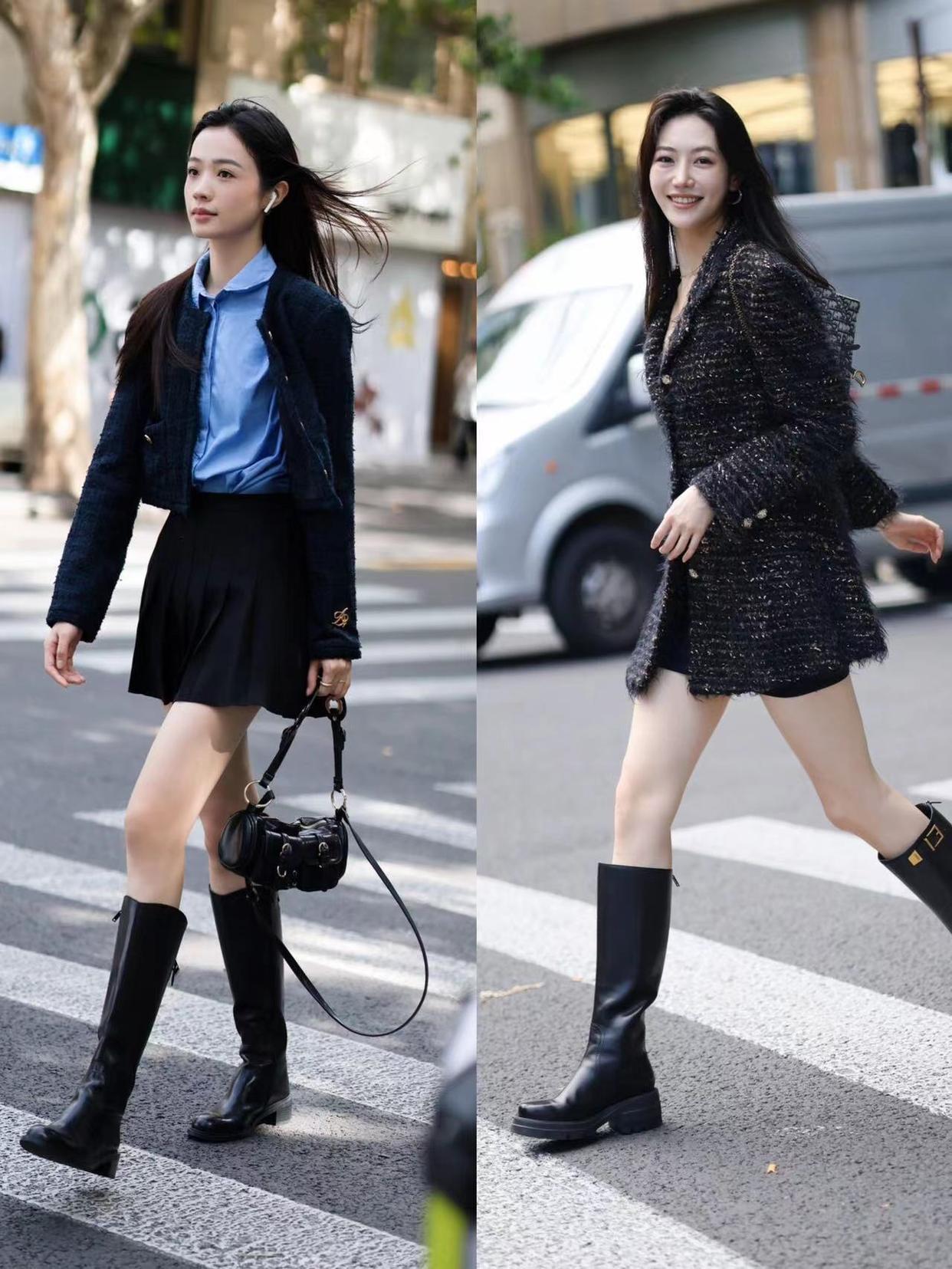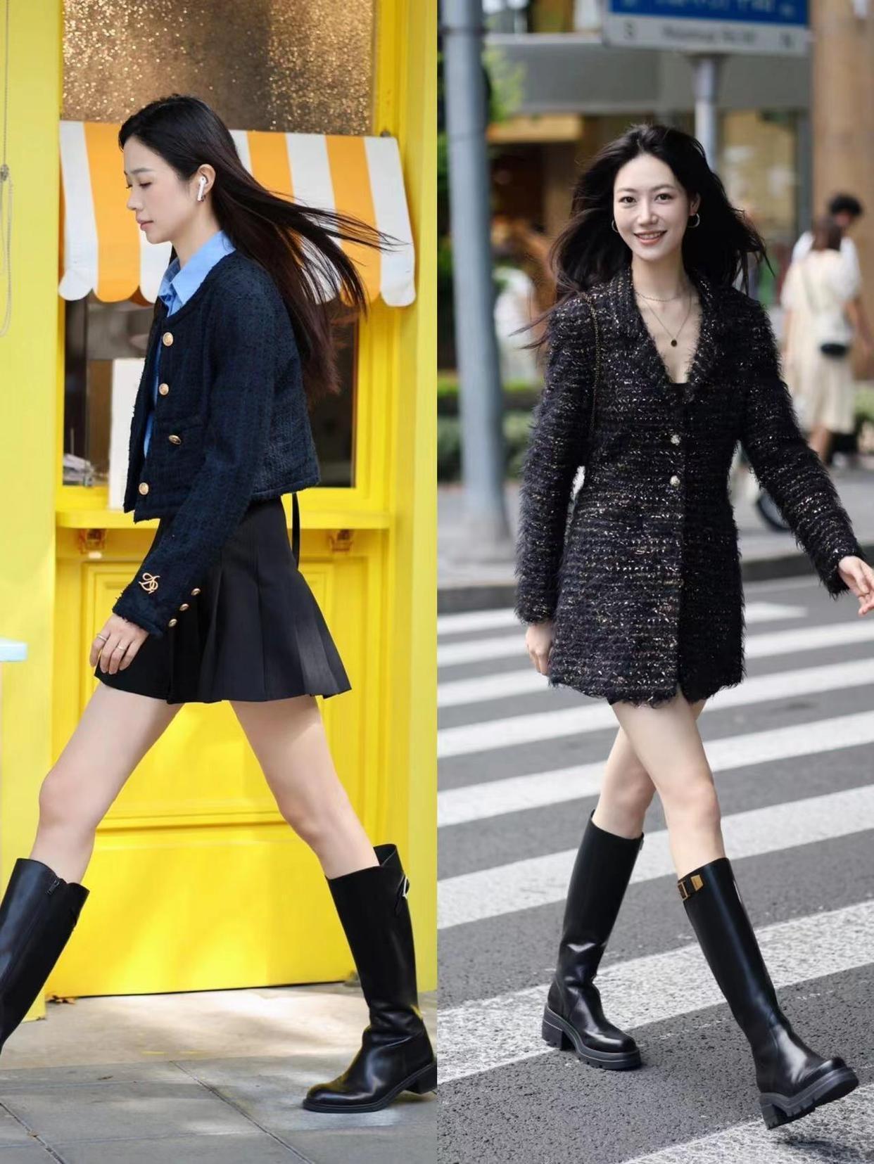一身黑色系的穿搭,給人一種很高級又醒目的美。像這種黑色短裙的套裝,搭配了厚底的及膝長靴,更加的熱辣張揚,給人一種氣場高級的霸道美。