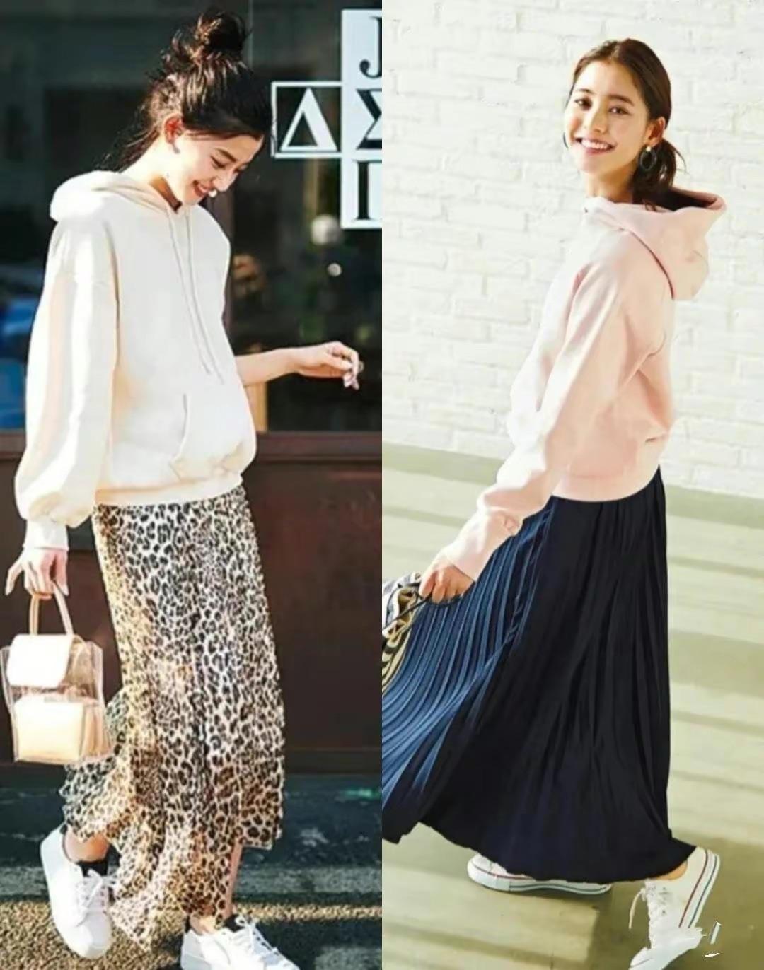 想要更加俏皮減齡一點,我們可以選擇稍微個性一點的半身來搭配基礎款衛衣。基礎款連帽衛衣,配豹紋半身裙或者百褶半身裙,都更加垂順耐看。