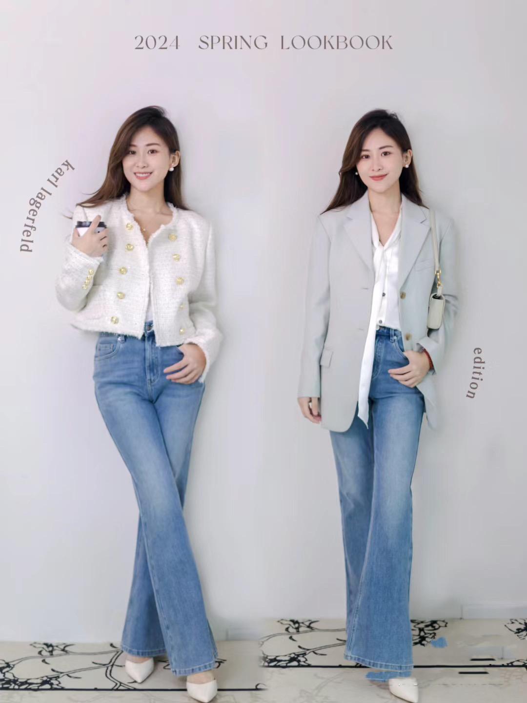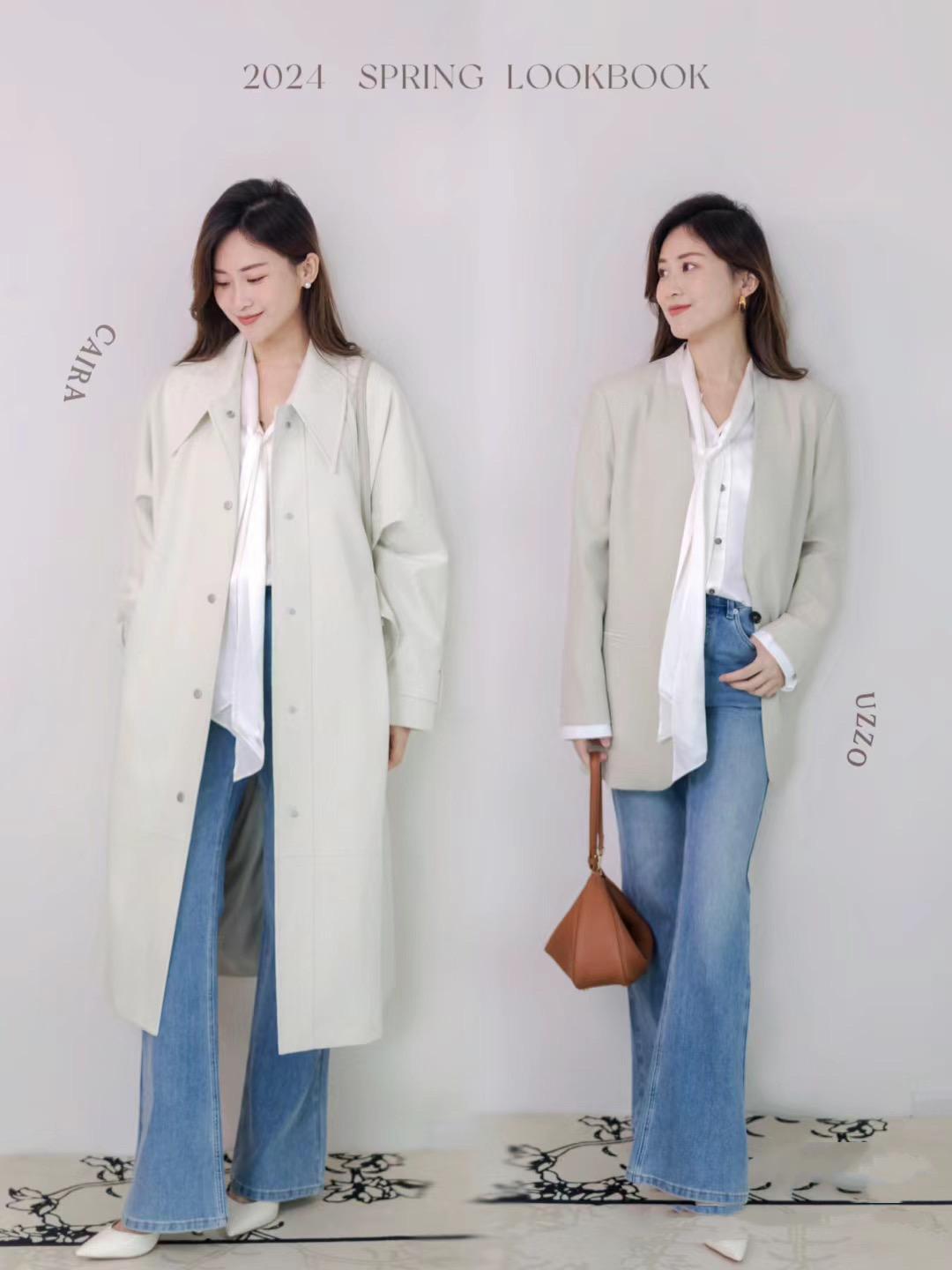 淺灰色系西服外套或者風衣外套,都可以疊搭清爽的白色襯衫來穿着。這種輕柔又高級的穿搭,給人一種很利落大氣的美,配上高腰的微喇牛仔褲、簡單時尚。