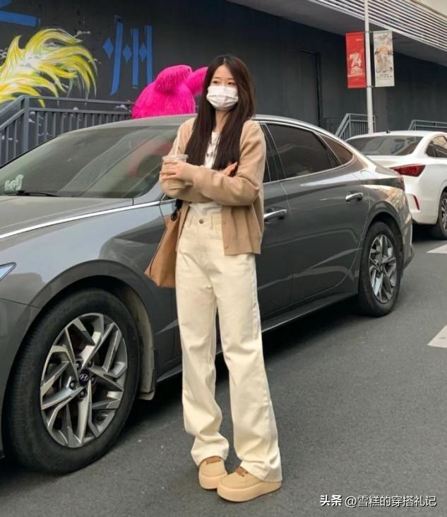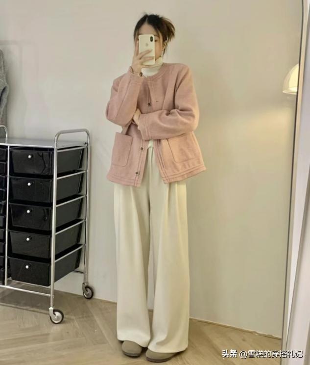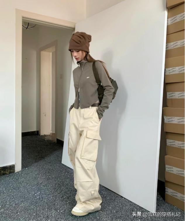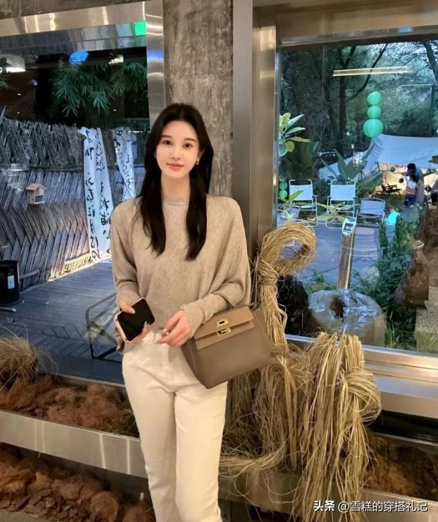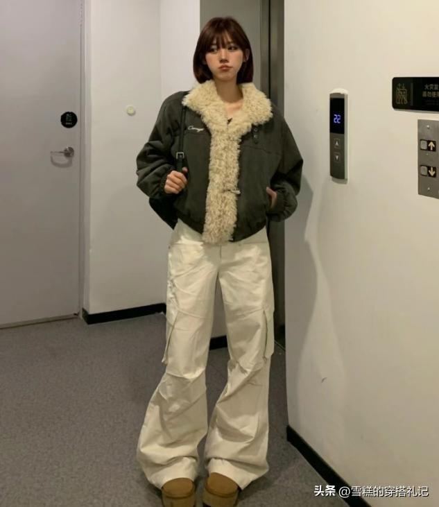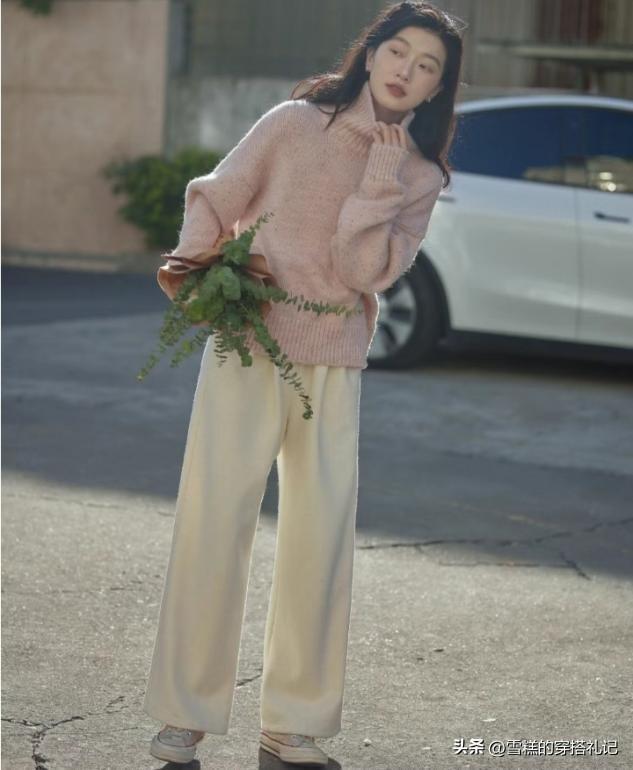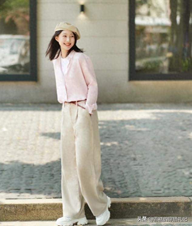 杏褲的面料,如果選擇的偏硬一點,那麼表面就可以呈現一些面料的褶皺感,縱向的直線條不打折扣,不用花色或者是亮色來做突兀,上衣可以選擇毛絨的質感,對比面料也可以穿出時尚度。