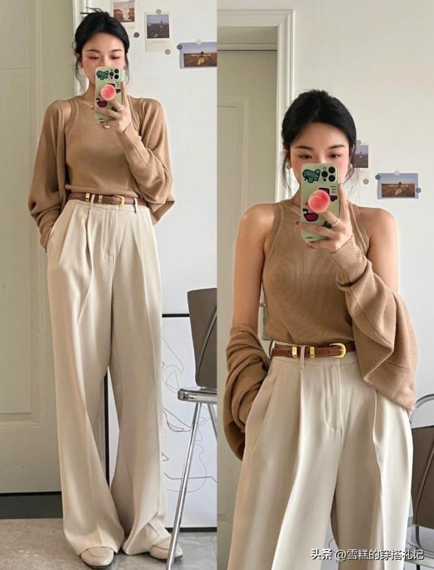 迴歸到造型配色的選擇上來看,深淺遞進的配色選擇,可以大膽的讓杏褲的顏色成爲淺色面,這種大色塊的溫和色調,皮膚偏黃的女生終於可以擺脫膚色的拖累,大膽穿淺色。