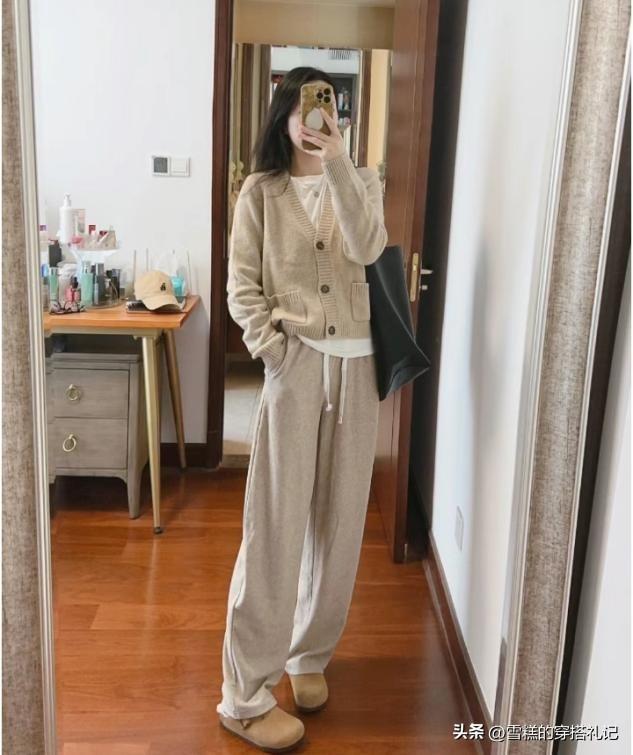 外套的款式正面可以選擇開衫設計,穿法就是突出兩層的設計技巧,直觀的展現出層次疊穿的視覺效果。這一類搭配的杏褲,很適合用圓頭圓腦的厚底鞋拉扯腿型,小個子女生不用擔心穿搭的頭重腳輕。