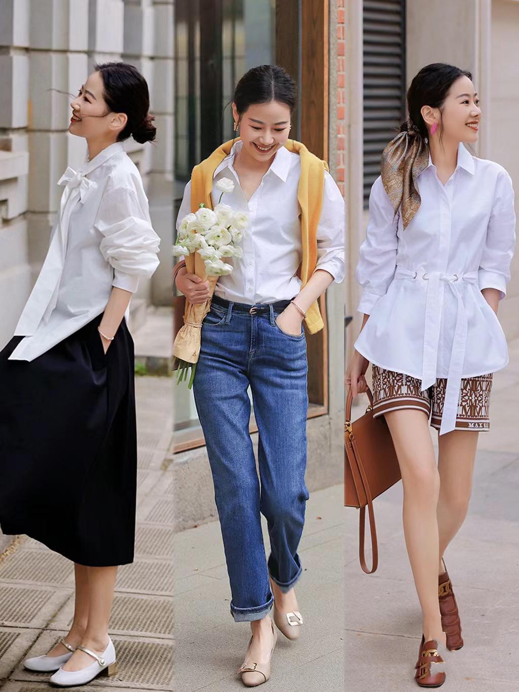 清爽的白襯衫搭配利落的牛仔褲,給人一種大氣又灑脫的美。春日的穿搭,更多了幾分清爽與幹練,不管是上班通勤、還是休閒出街,都是不錯的選擇。