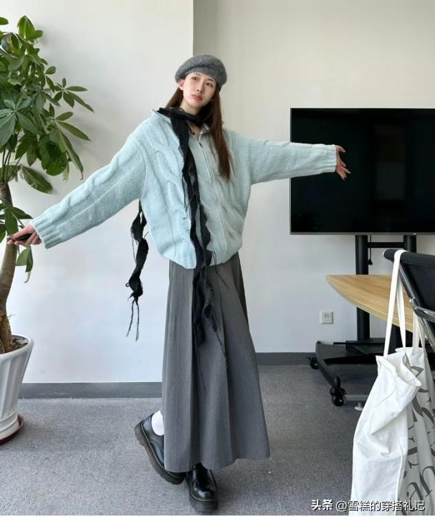 霧霾藍色的低飽和度,讓我們去駕馭其他的深色系,也更加的遊刃有餘了,一件開衫款式的毛衣作爲外搭,內搭款式的服裝可以是高亮的色彩,也可以是純黑色的駕馭,讓膚色偏黃黑的女人穿衣擁有深淺色系對比的效果。