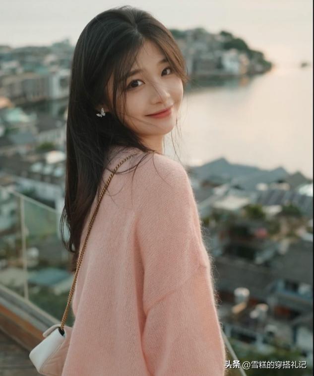 從圖片當中的主意粉色來看,這是一種淡淡的櫻花的粉紅色,用來點綴毛衣上衣,沒有膚色壓力,色彩比較淺淡,也很容易顯白。