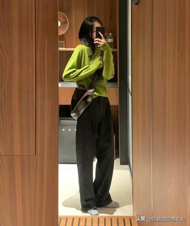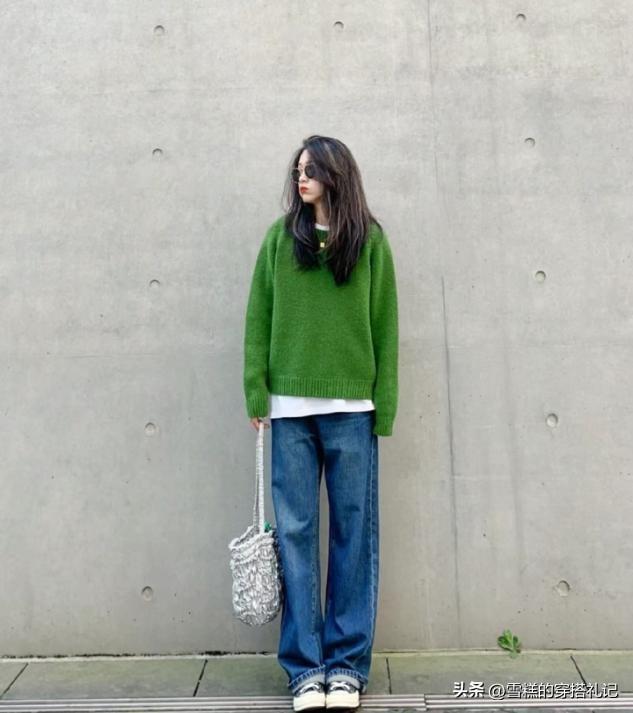 用毛衣選擇超短款的比例,可以縮短草綠色在視覺當中的佔比,如果說你是第一次去穿草綠色的毛衣,那麼我們就建議你從這種比較保險的選擇進行入手,短款毛衣的穿法也會比較顯高顯瘦。