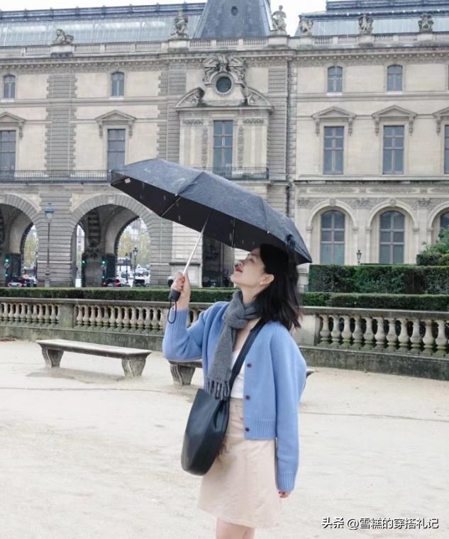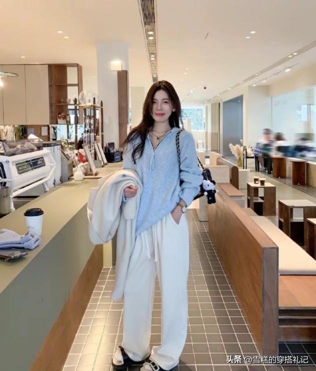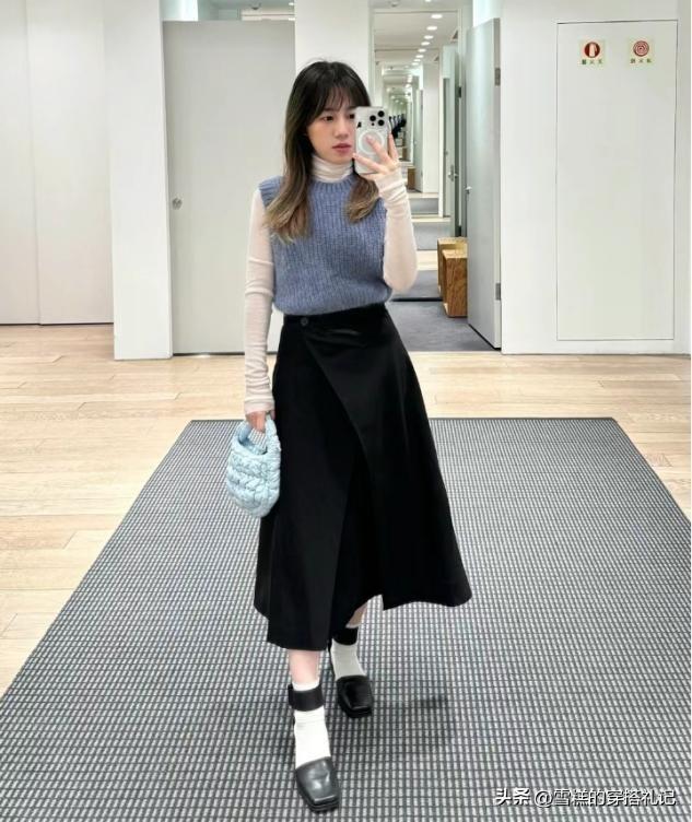 我們仔細去分析藍白配色的優勢,會發現白色的清爽感剛好可以匹配藍色的清新感,而霧霾藍色降低了深藍色的一些厚重色調,所以毛衣穿搭的厚一點也不會顯臃腫,顯肥胖,可以讓你大膽的去組合裙子或者褲裝。