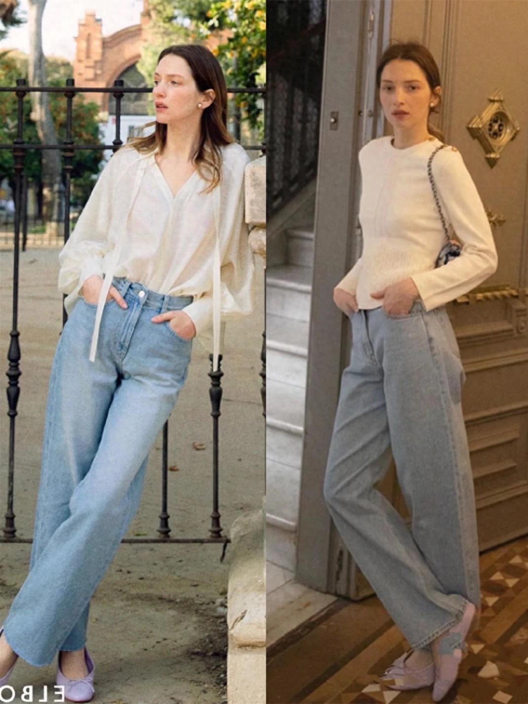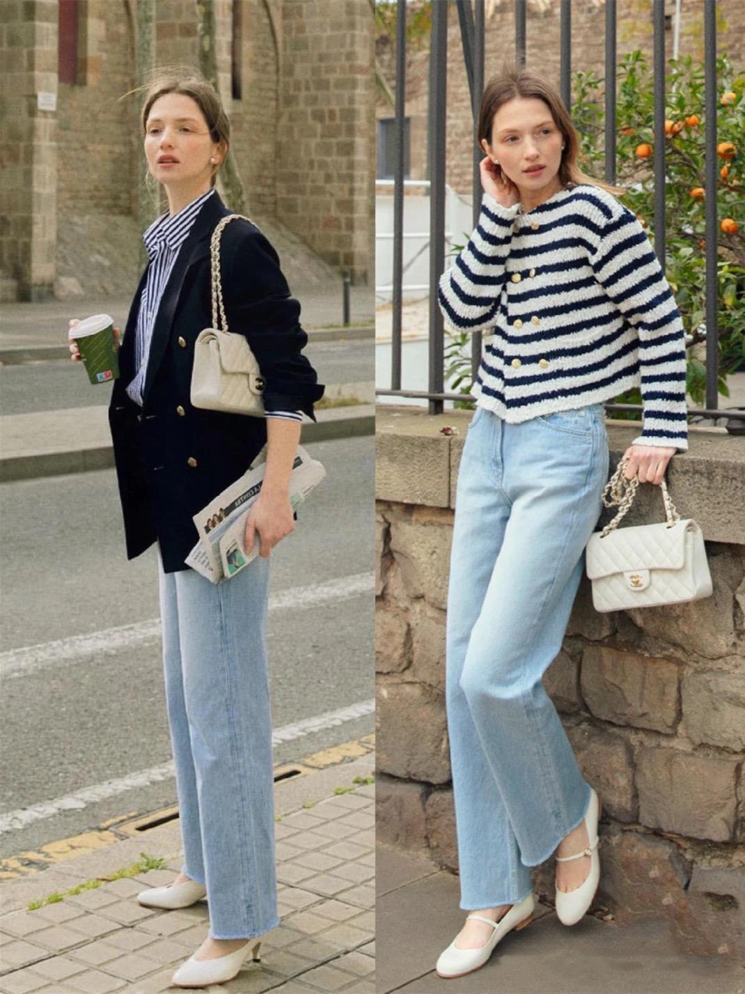 稍微寬鬆的牛仔褲,可以搭配直筒的版型。這種款式的牛仔褲,不像闊腿褲那麼寬鬆肥大,既利落又舒適,搭配貓跟鞋還可以更顯氣質。
