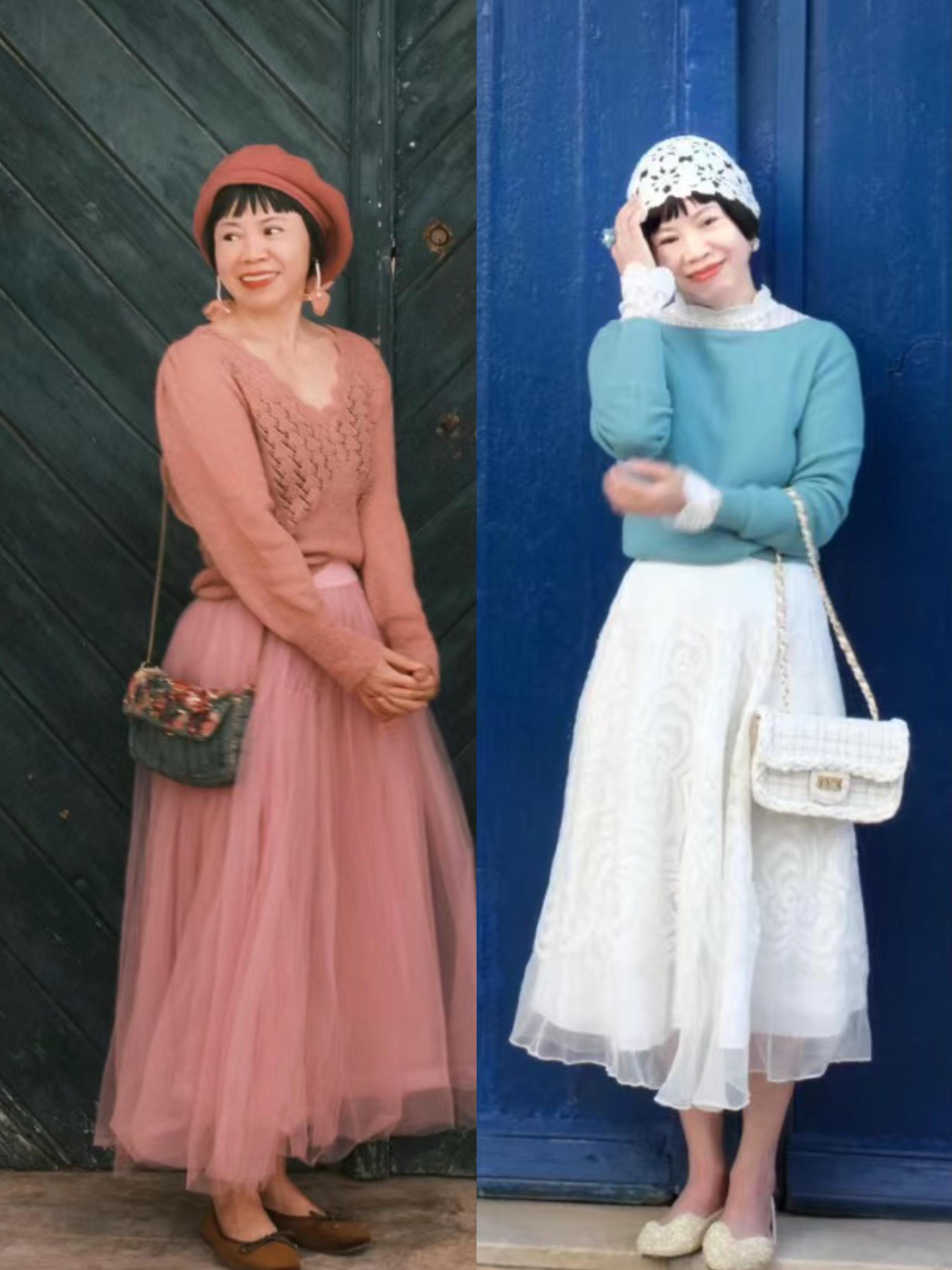 四五十歲的年紀,依然可以借鑑小女生喜歡的一些穿搭模板呀。比如色彩明亮的針織開衫,可以搭配收腰的蕾絲吊帶裙來穿着。
