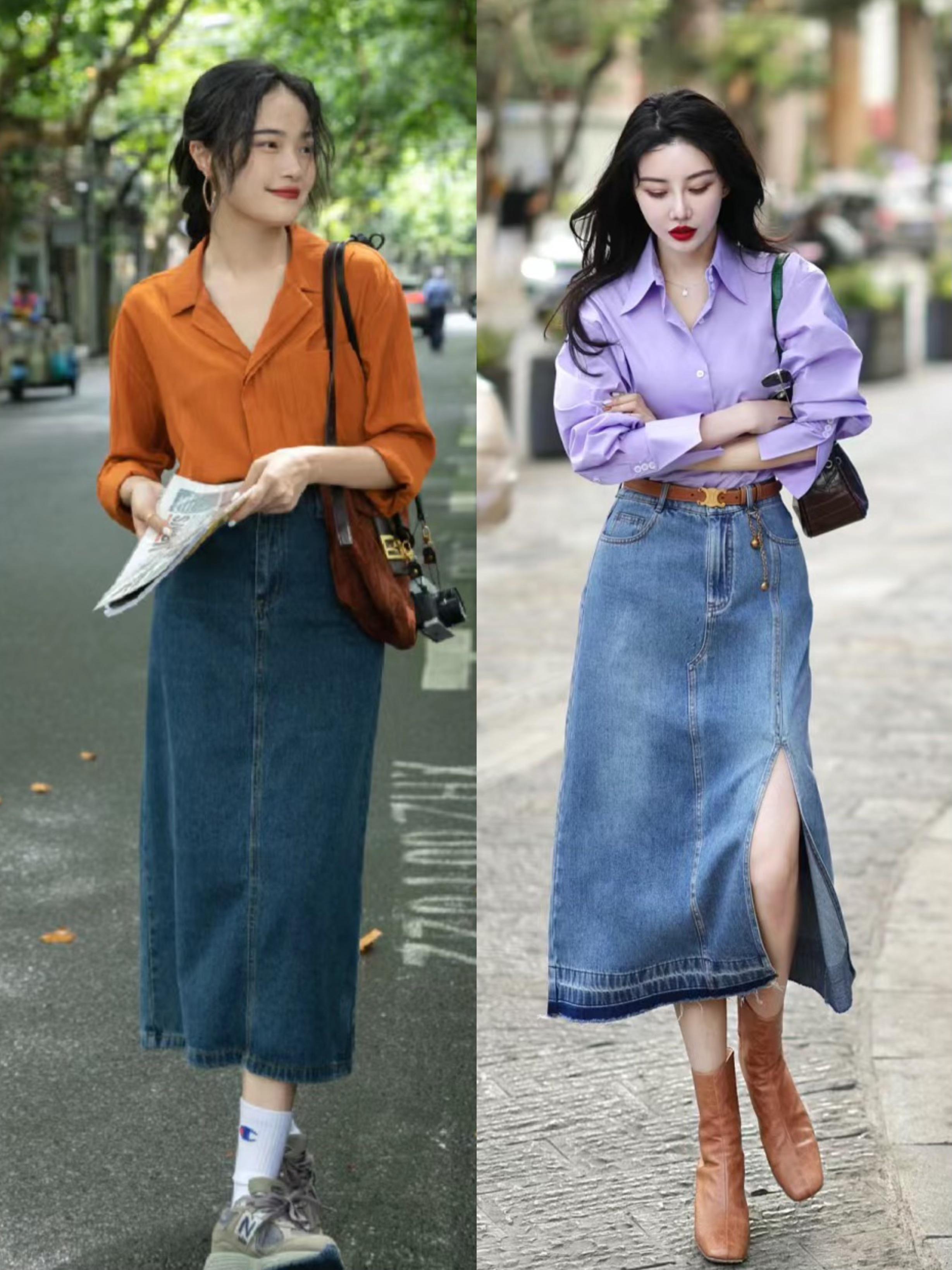 比如橘色系的襯衫,來搭配復古藍的牛仔半身裙,就有一種港風氛圍。淺紫色寬鬆襯衫,搭配高腰的A字形牛仔半身裙,就更加時髦摩登一些。