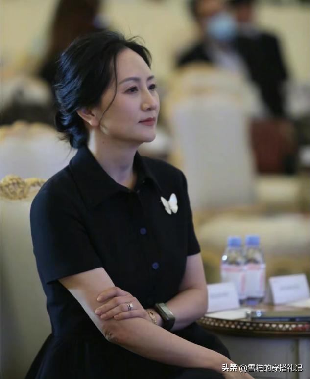 大家在搭配首飾的時候,一定要注意整體的數量。集中在頭頸位置的首飾,最多選擇兩件即可,這樣可以在上班時保留足夠的空白,顯得更加輕盈透氣。比如孟晚舟在穿黑色連衣裙時配上了蝴蝶形狀的胸針豐富了上半身的造型,那麼脖子和耳朵附近就不要再搭配首飾了,否則會顯得格外的厚重。