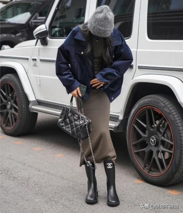 疊穿的法則更適合短外套牛仔或者開衫外套,平衡上短下長的比例,長裙修身穿搭,穿長筒靴也是很有看點的。