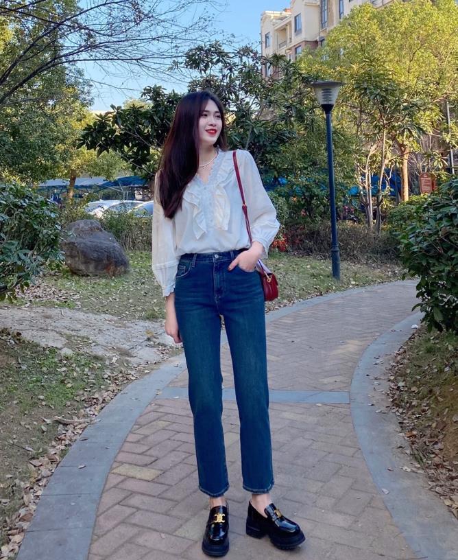 最期待的就是春天了,溫度上升後就把厚重的外套脫下來吧,在南方的女性們,出門一件襯衫就基本可以搞定。白色花邊v領襯衫+直筒褲,再搭配一雙樂福鞋,秒變大長腿。