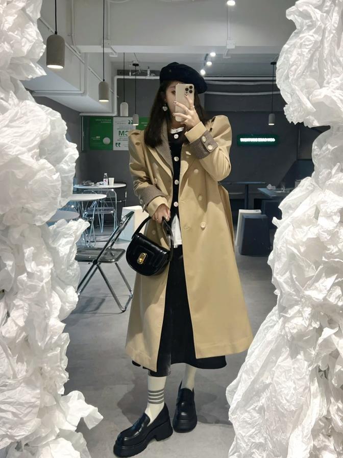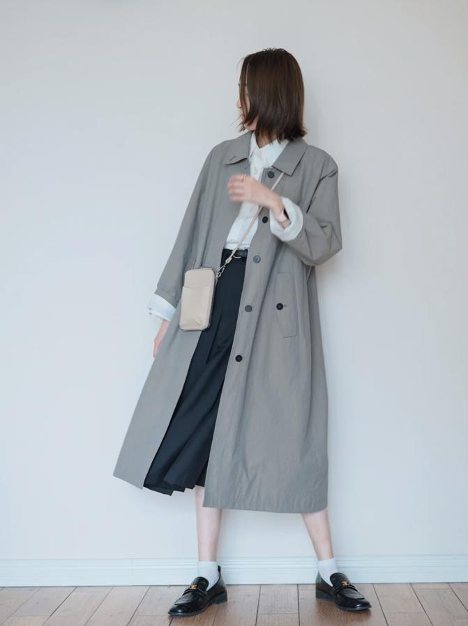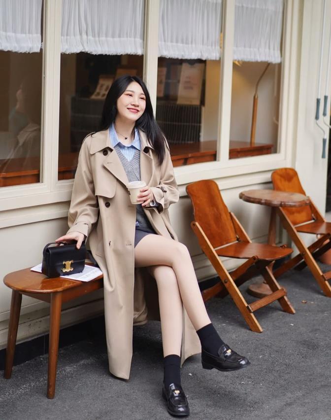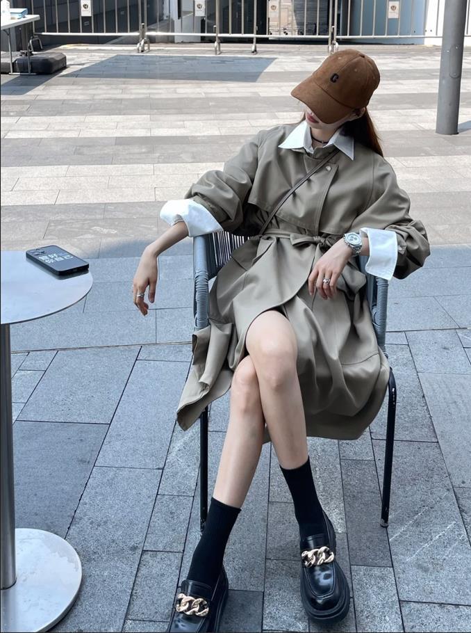 春天的第一件外套,不如就選風衣吧,簡約又不失大方的款式,輕鬆就能打造出時髦感。繫腰帶的設計,不僅修飾身材比例,還顯瘦,搭配黑色樂福鞋和襪子,乖巧又好看。