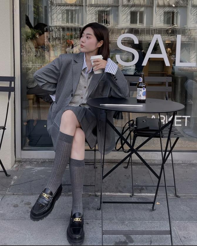灰色系疊穿,簡直不要太高級了,西裝+半裙+樂福鞋,廓形版型的西裝,對身材有着很好的包容性。內搭條紋襯衫和針織馬甲,一下子就爲整個造型增加了層次感。
