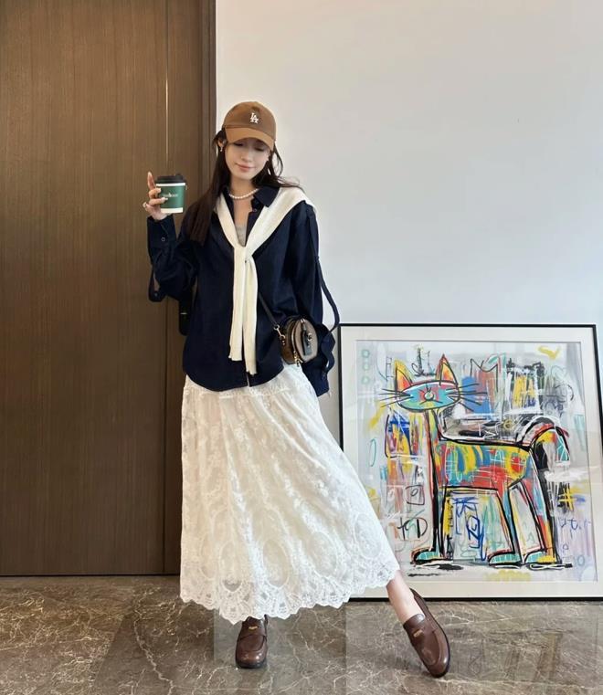 復古鬆弛感的穿搭,看着就非常不錯呢,復古藍寬鬆襯衫知性又高級,搭配白色蕾絲半裙,真的是韓到了骨子裏,超溫柔的。