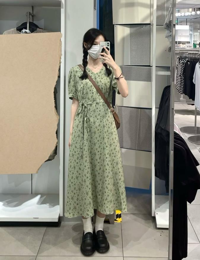復古綠色碎花連衣裙,穿起來真的好顯白啊,小v領的設計,輕鬆拉長脖子線條,還顯瘦。腰間增加了一條繫帶,可以隨意調整。一雙黑色樂福鞋的加持,更顯舒適和溫柔。