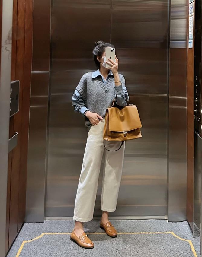 150-158姐妹都合適的一套穿搭,在春季,疊穿這種搭配方式依舊可以安排起來,灰色馬甲搭配藍色襯衫,沉靜又簡單。