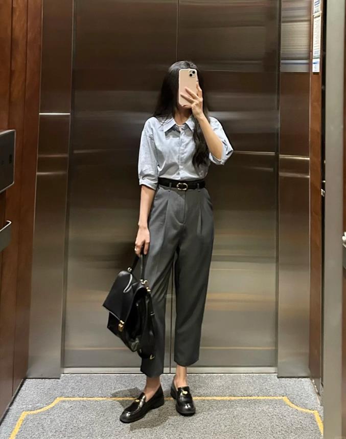 適合上班通勤的一套,簡簡單單就很好看,灰藍襯衫+灰色西裝褲,簡單又不落俗氣的搭配,上班逛街都合適。