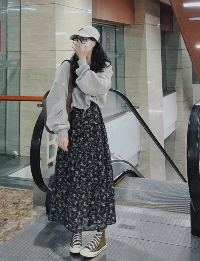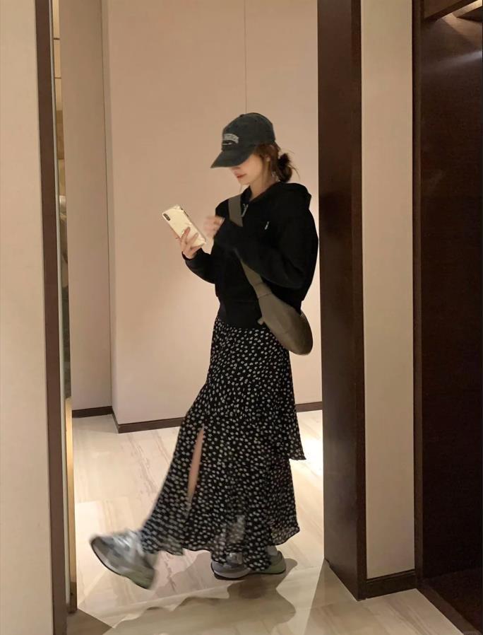 好顯慵懶舒適的一套,黑色連帽衛衣+碎花半裙,這也太韓了吧,再加上一雙運動鞋,輕鬆增加了休閒舒適感。