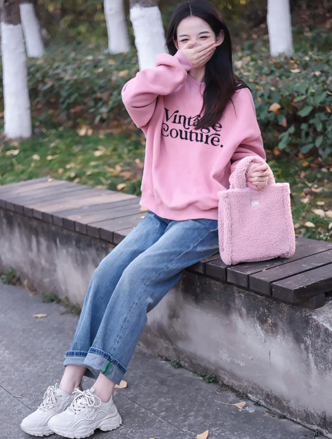 溫柔少女範的穿搭,相信很多姐妹們都會喜歡吧?粉色衛衣+直筒牛仔褲,再搭配一雙休閒舒適的老爹鞋,甜美減齡又顯高顯瘦。