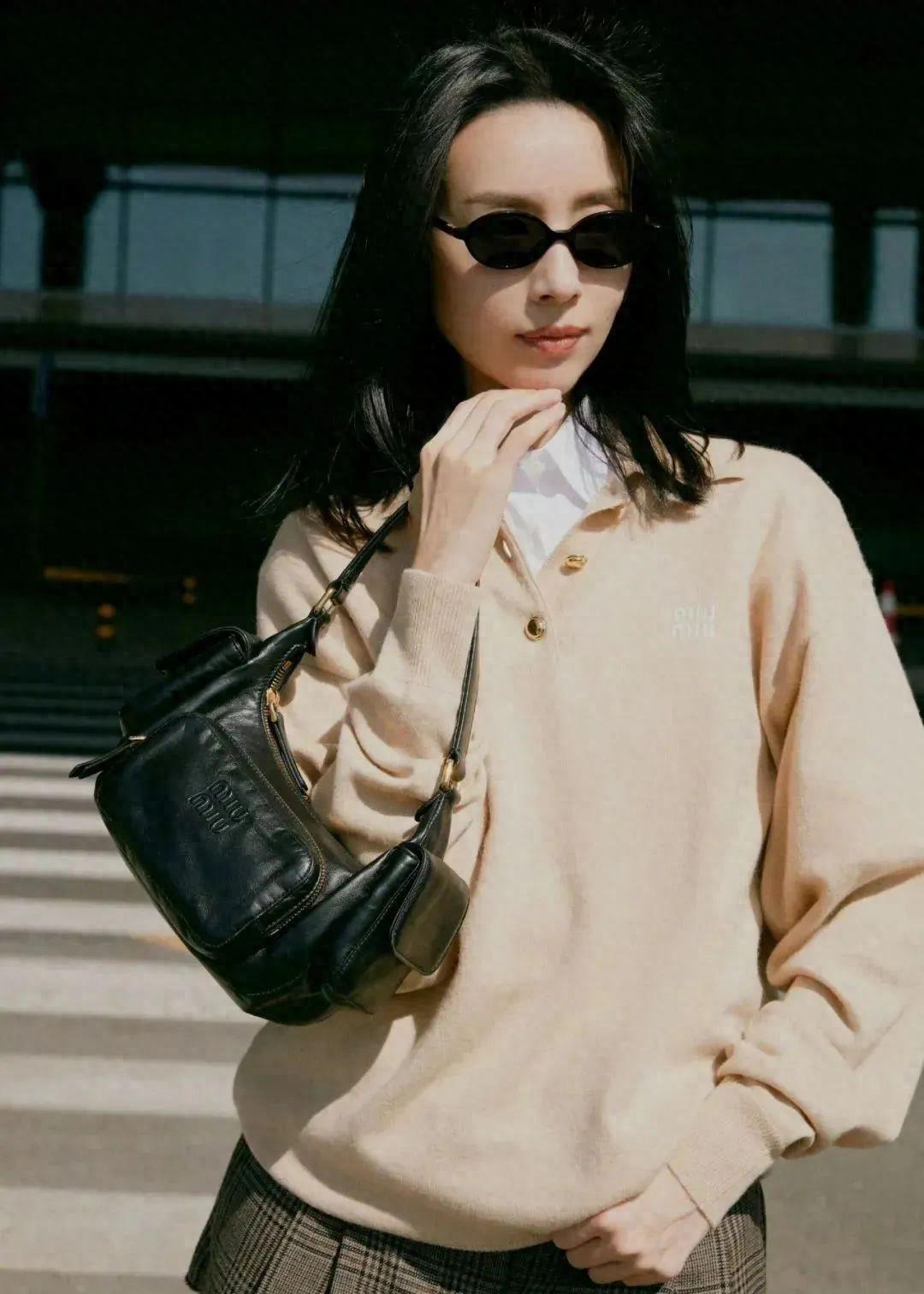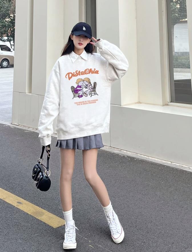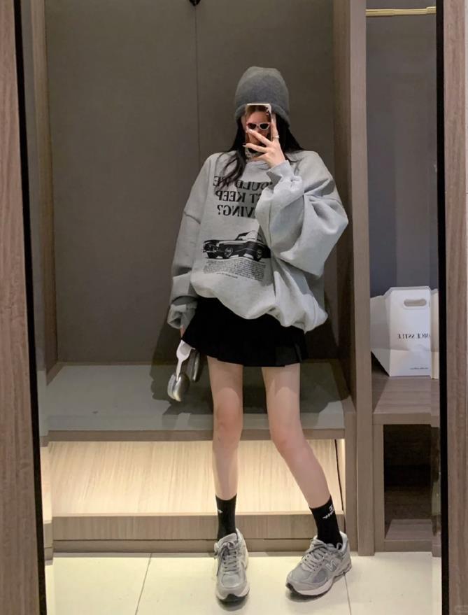 灰色的衛衣,和百褶裙顏色很搭,減齡又時髦。