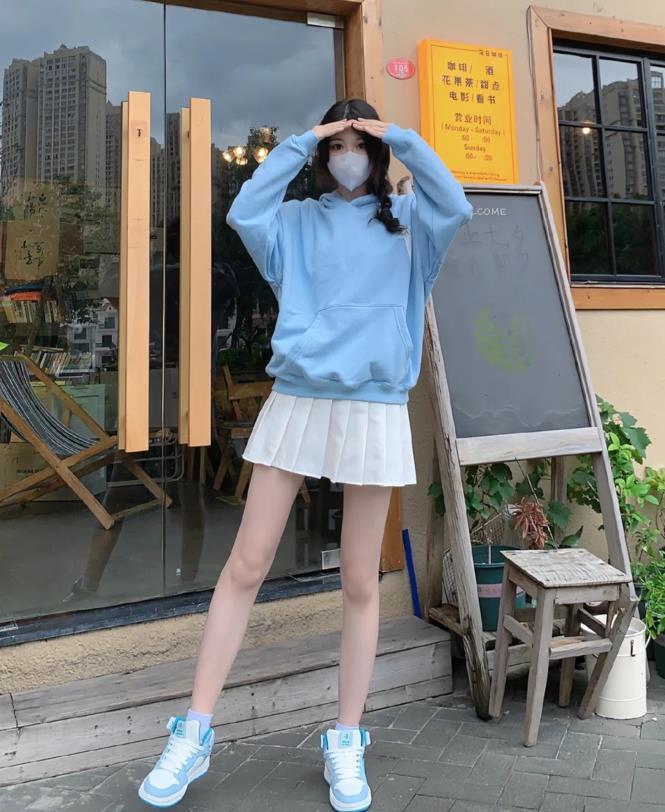 藍色的衛衣,看起來又甜又軟糯的,一整個被奶住了,搭配白色百褶短裙,青春活力滿滿~腳下踩着的運動鞋,顏色與上衣下裝都進行了色彩呼應,完美極了。