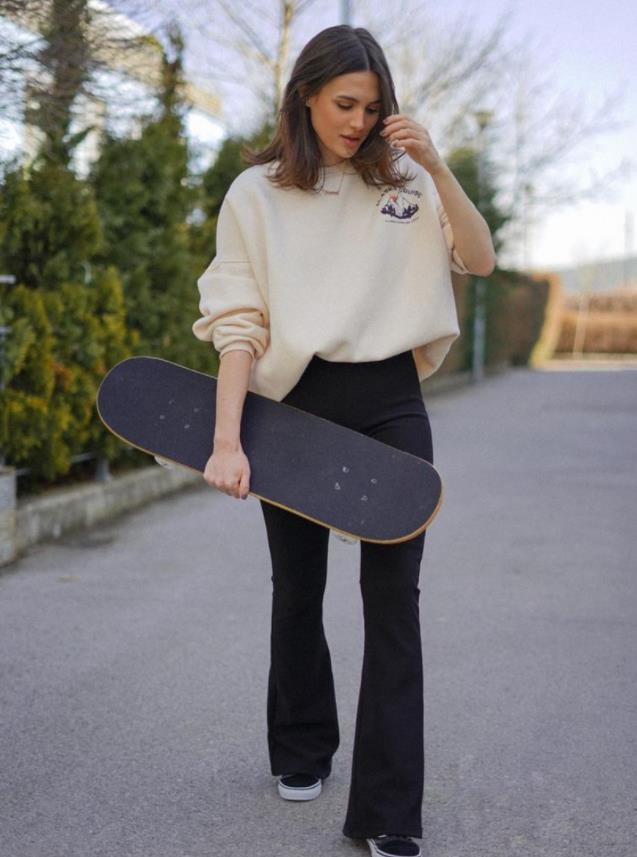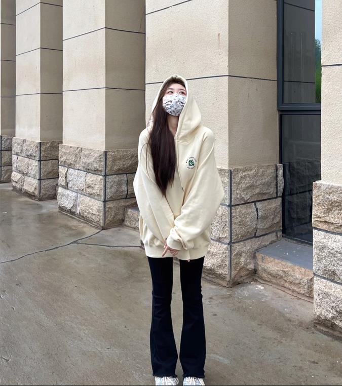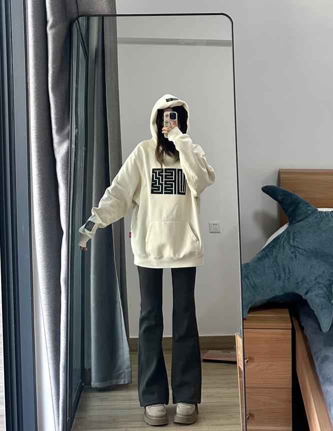 奶白色的連帽衛衣,不僅百搭,看起來還非常溫柔,寬鬆的版型襯托下,什麼身材的缺點都被隱藏起來。搭配一條微喇褲,又多了幾分氣質感,時髦度飆升。