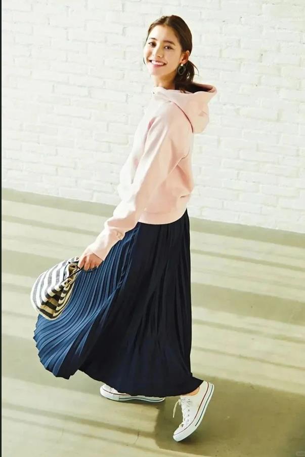 粉色衛衣,看起來就很嫩很減齡啊,淺淺的低飽和度粉,一點都不挑膚色,搭配藏藍色百褶半身長裙,優雅氣質又溫柔。