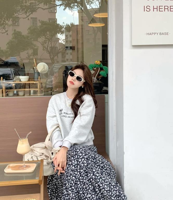 韓系滿滿的一套,春天這樣穿也太好看了吧,灰色刺繡衛衣搭配小碎花裙,這一套灰黑色百搭又慵懶。