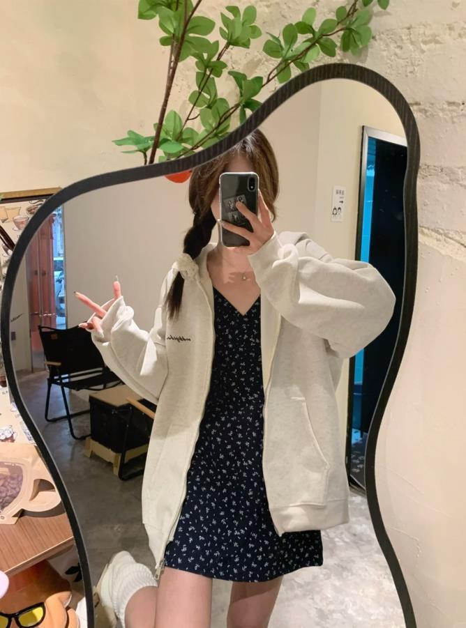 衛衣和碎花裙的搭配,實在是太韓了,充滿小清新又很減齡,白色的連帽衛衣外套,怎麼搭配都好看。配深色碎花連衣裙,一簡一繁的組合,輕鬆打造出層次。