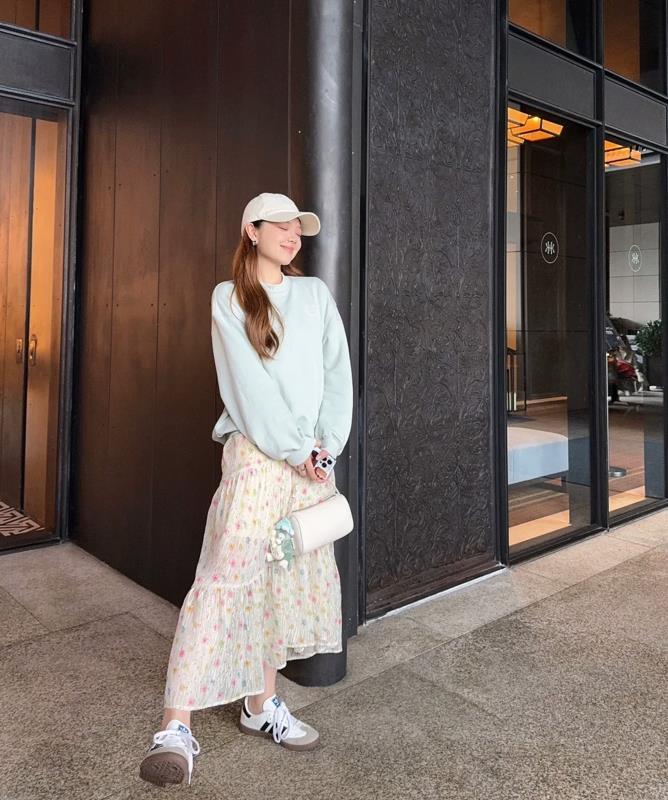 碎花裙+衛衣,又甜又休閒的韓系穿搭,春天這麼穿正好,喜歡這種低飽和度的亮色衛衣,一點都不挑膚色,黃黑皮也能駕馭。
