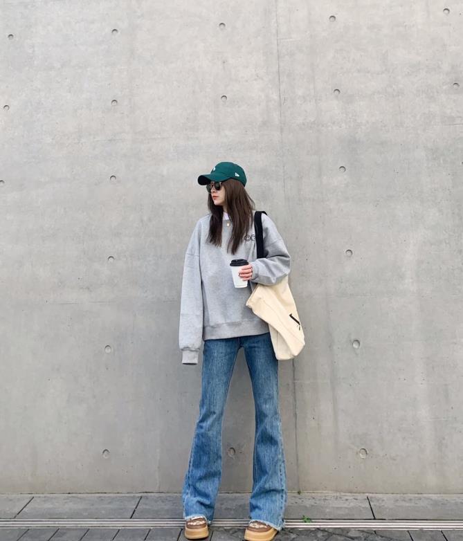 灰色衛衣+牛仔微喇褲,輕輕鬆鬆又舒服的一套,微喇版型的褲子,穿起來不僅顯瘦還顯腿長。頭上佩戴起來的棒球帽,更爲整個穿搭注入了青春與活力氣息。