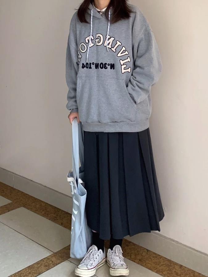 很適合懶人的穿搭,灰色衛衣+百褶半裙,基礎又不會出錯的搭配,整體看起來就很日系,也適合懶人。