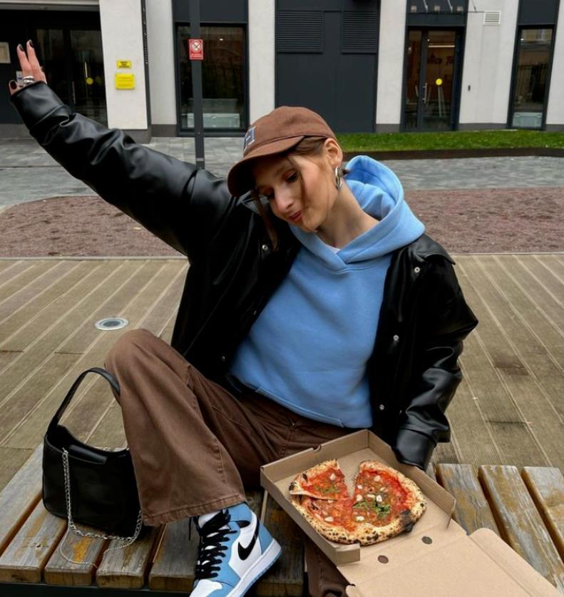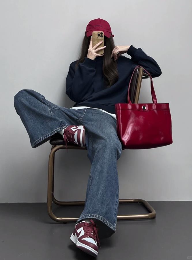 很顯高級的紅藍配美式穿搭,顏色比較暗的藍色衛衣,寬鬆的版型,對於身材包容性很強,搭配闊腿牛仔褲,實在是太顯瘦了。