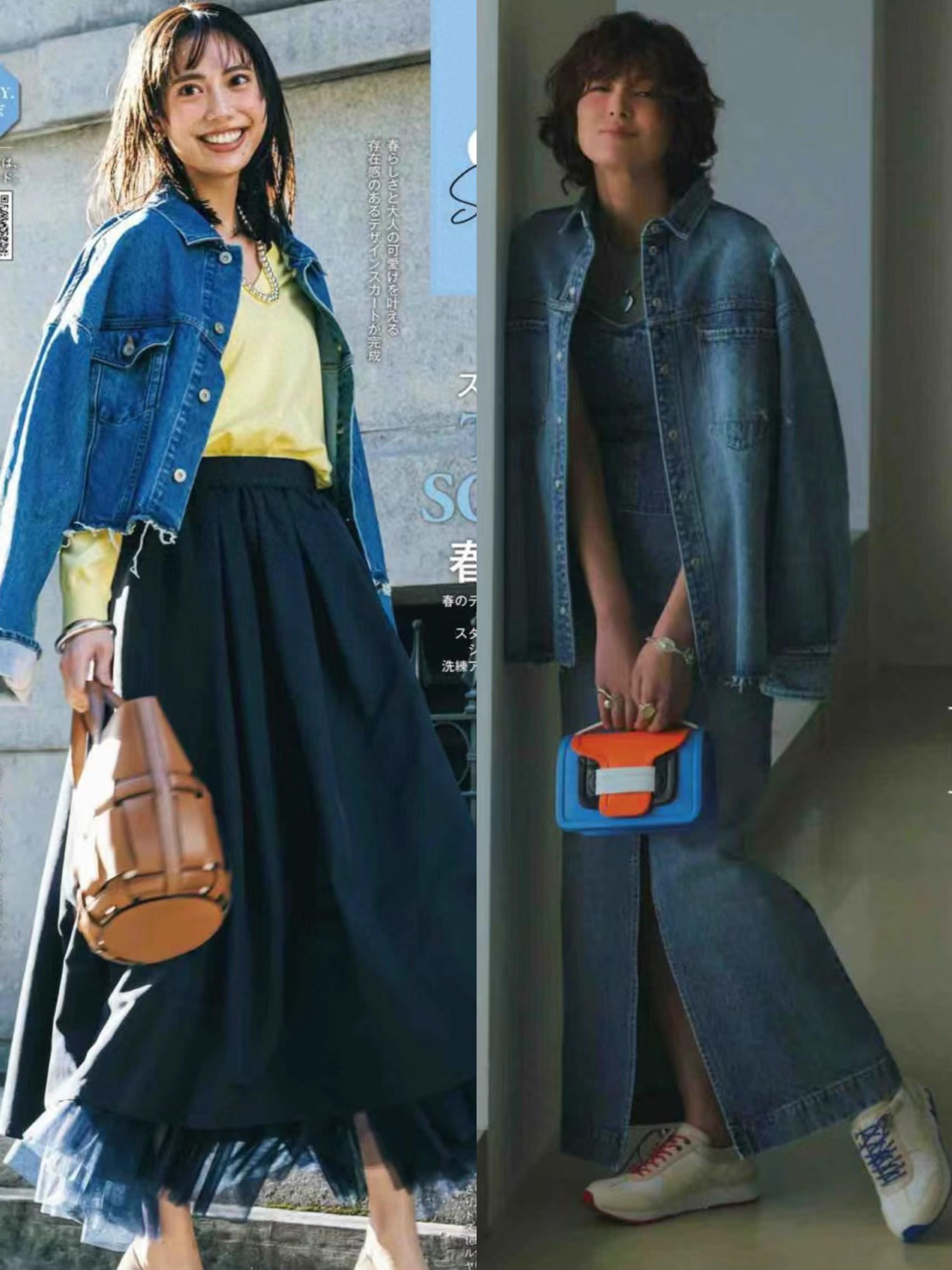 不管是短款的牛仔外套,還是長款的牛仔外套,在春日穿搭中都有自己的用武之地。我們可以用牛仔外套來搭配高腰的半身裙,配合內搭塞衣角的方式,抬高腰部重心。